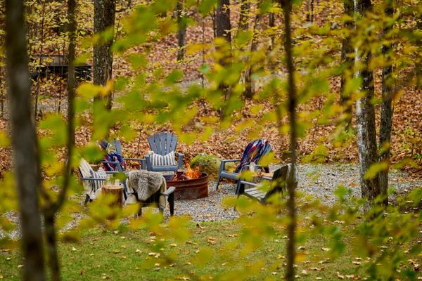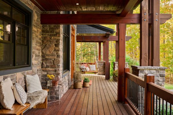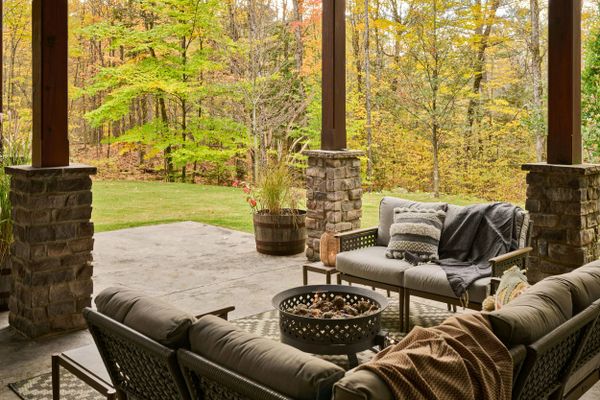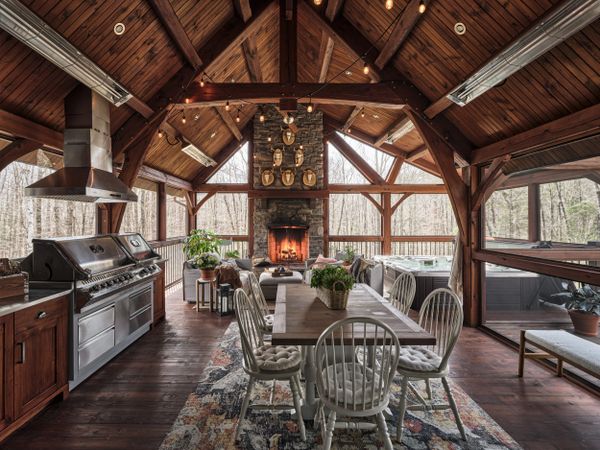 La présence d’un téléviseur de grande dimension assortis de haut-parleurs extérieurspermet d'agrémenter les moments de détente et de repas avec divertissements et musique. La véranda s'ouvre sur un balcon extérieur supplémentaire, qui invite à s'aventurer plus loin dans le décor boisé.