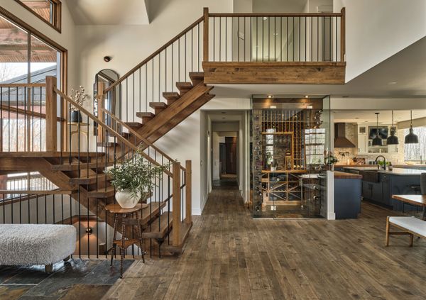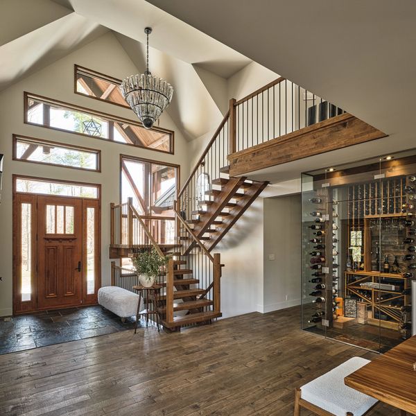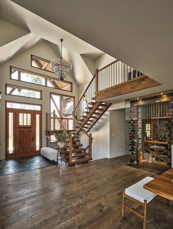 En franchissant la majestueuse porte en bois de merisier massif, on est immédiatement accueilli par une entrée chaleureuse et bien éclairée, où le plafond cathédral ajoute une sensation d'espace ouvert et aéré. La cage d'escalier en bois d’érable massif attire le regard, tandis que le sol, en ardoise, ancre l'espace avec élégance et solidité. Cet accueil initial dans la maison éveille un sentiment de grandeur et de convivialité.