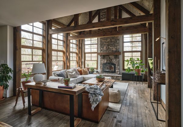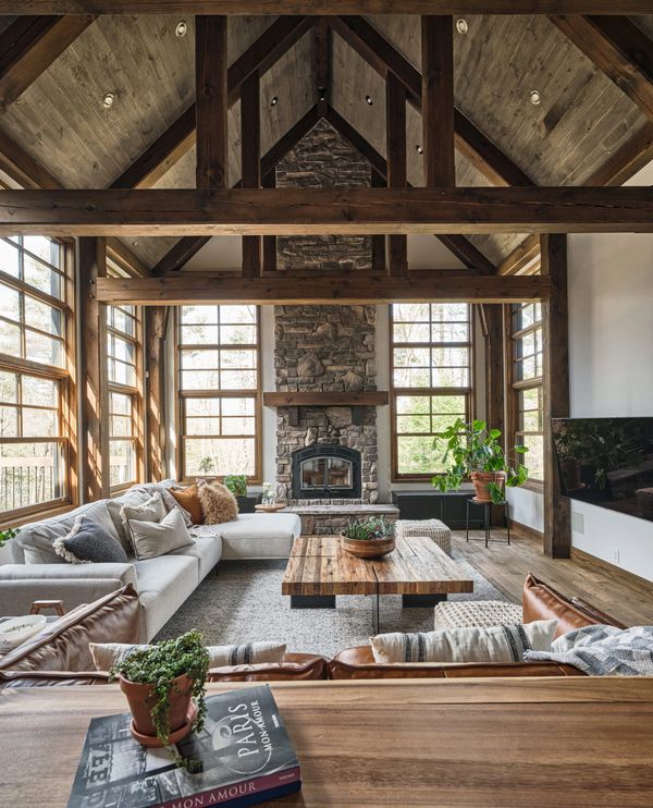 Cette élégante pièce allie harmonieusement design rustique et fonctionnalité contemporaine. Les poutres apparentes et le foyer en pierre ajoutent un charme architectural indéniable, évoquant chaleur et histoire. Les larges fenêtres, disposées sur tous les murs, ajoutent au décor déjà majestueux, la beauté de la nature extérieure tout en inondant l'espace d'une lumière naturelle vivifiante. Un immense téléviseur, haut de gamme, équipe également cet espace de vie remarquable. Ce salon est le parfait équilibre entre l’esthétisme et le confort pratique, idéal pour se détendre ou se divertir.