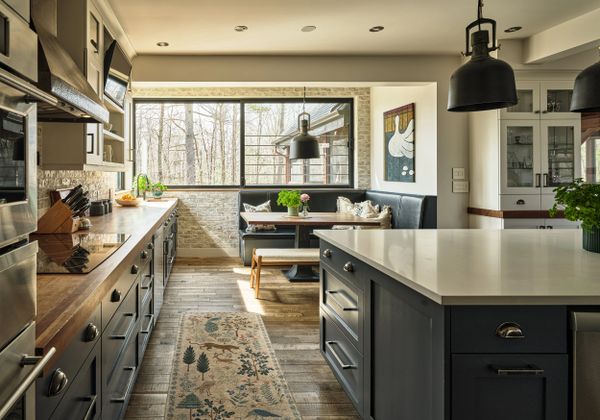 La cuisine est l'incarnation de la convivialité et de l'élégance moderne. En son cœur, un grand îlot de Quartz, point de ralliement pour la famille et les amis, s'accompagne d'une banquette déjeuner intégrée. La pièce est baignée de lumière naturelle grâce à de grandes fenêtres qui encadrent une vue apaisante sur la forêt, reliant ainsi l'espace à la nature environnante.