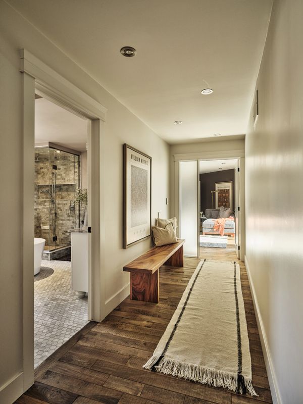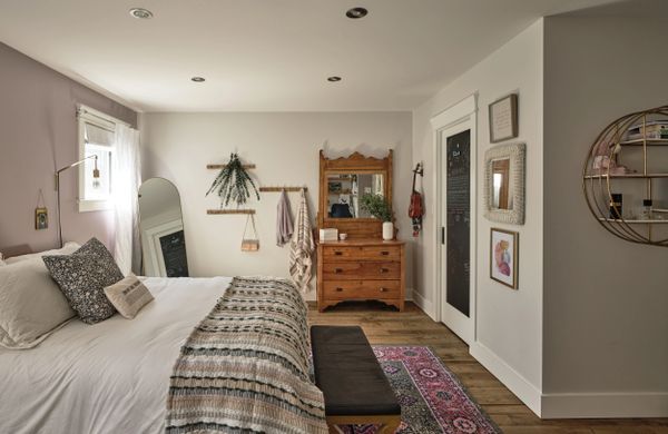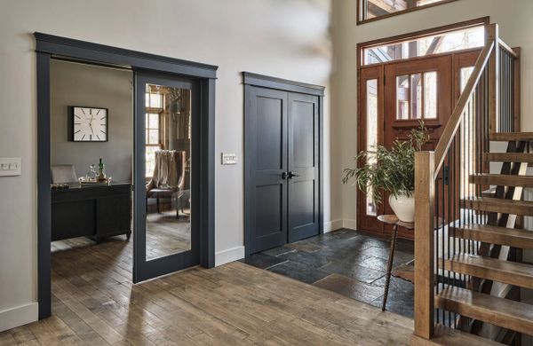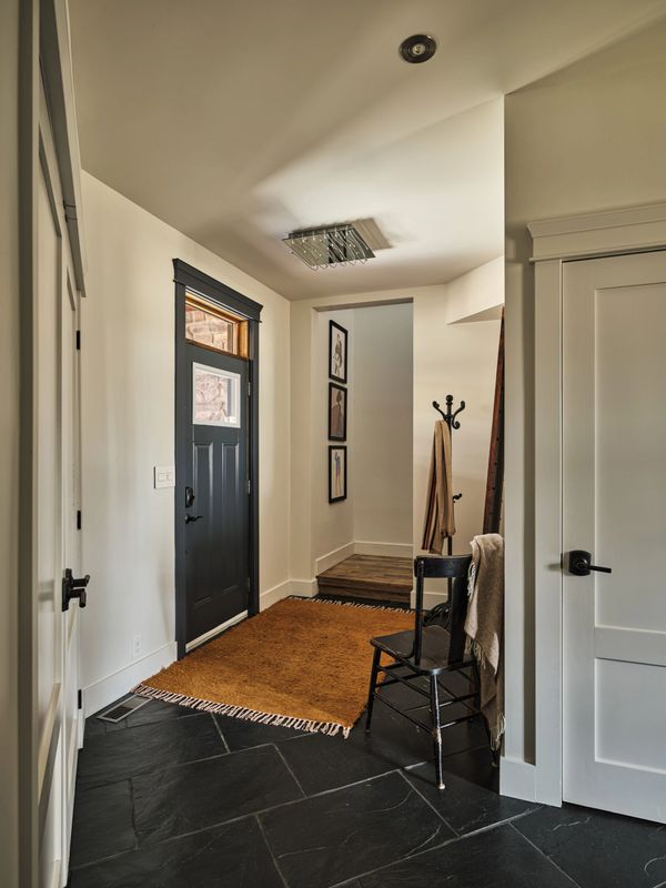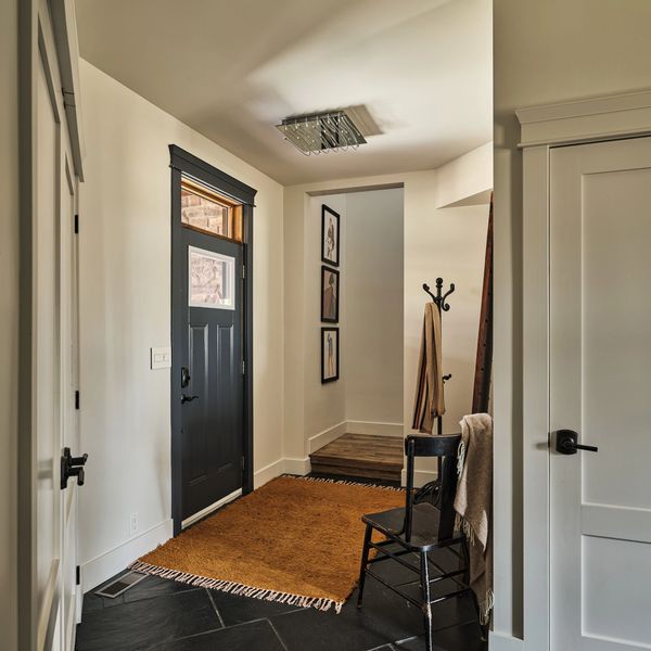 Voici une entrée secondaire située à l'avant de la maison. Dès que l'on passe cette porte, on entre dans un espace qui mène à une salle d'eau et au mudroom. De là, on peut aussi accéder à l'escalier qui conduit au loft aménagé au deuxième étage.