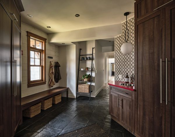 Le mudroom, cœur fonctionnel de la maison, est un espace conçu pour la transition entre le confort intérieur et l'extérieur. Doté d’un comptoir avec lavabo distinct qui facilite les nettoyages rapides et contribue à maintenir la propreté de l'espace. De vastes armoires s'élèvent de chaque côté, fournissant une abondance de rangement pour les vêtements d'extérieur et les accessoires. Le plancher est recouvert de dalles d'ardoise, qui ajoutent à la noblesse de cet espace ordonné et achalandé au quotidien.