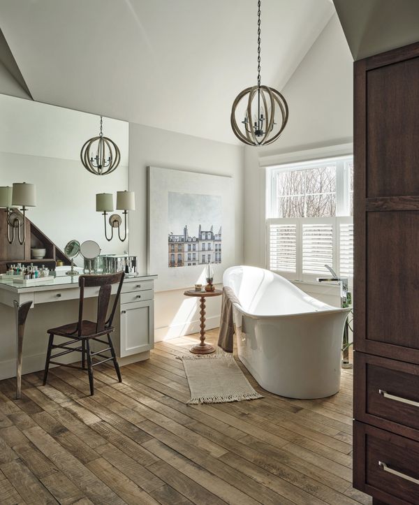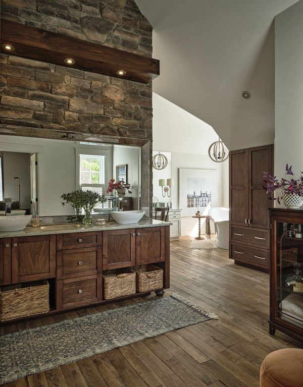 La suite parentale est un espace de confort raffiné, conçue pour offrir une expérience de détente et de luxe. Elle est équipée de meubles en bois fait sur mesure, robustes et élégants, complétés par un comptoir de granit lisse et deux lavabos pratiques pour un usage simultané. Le mur de pierre confère à la pièce une atmosphère chaleureuse tandis que le plafond cathédral accentue la sensation de grandeur et de raffinement.