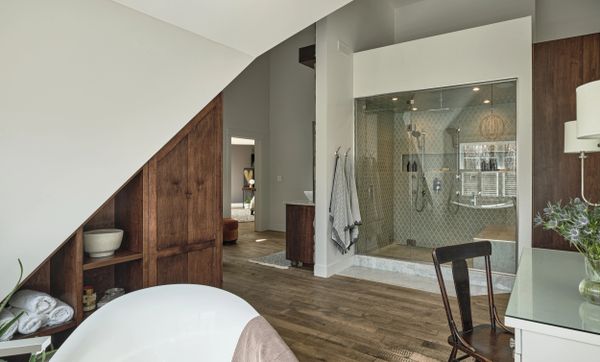 Cette salle d’eau, stratégiquement située au rez-de-chaussée entre le mudroom et l'entrée secondaire menant au loft, est dotée d'équipements de qualité. Un pièce pratique moderne et accueillante.
