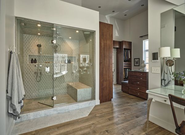 Cette douche double spacieuse avec plancher de marbre et murs en céramique, donne à l'ensemble un air de luxe et d'élégance. Elle comprend un large banc pour le confort, une large niche pour le rangement pratique des produits de bain, et une enceinte acoustique encastrée. L'installation inclut un système de douche vapeur, pour profiter des bienfaits d'un hammam privé.