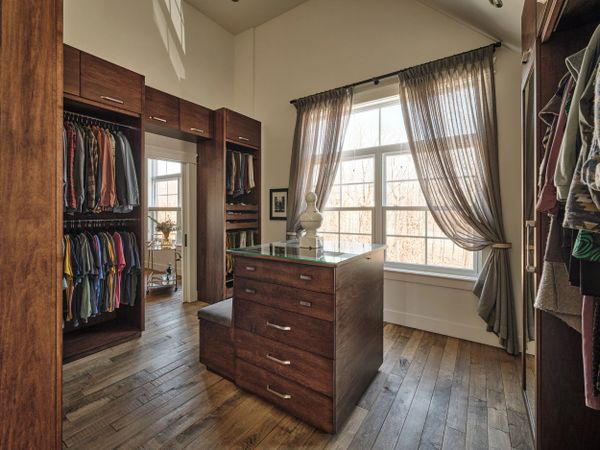 La garde-robe walk-in de la suite parentale présente un design sophistiqué et fonctionnel. Il dispose d'un îlot central, fournissant une surface pratique pour la sélection et l'organisation des vêtements. L'éclairage est bien pensé, offrant une visibilité claire de tous les articles. Le rangement est abondant avec des armoires de bois faites sur mesure, idéales pour une utilisation optimisée par elle et lui. Les finitions en bois sombre ajoutent une touche d'élégance et de chaleur à cet espace, pour que le choix des tenues quotidiennes soit facile et agréable.