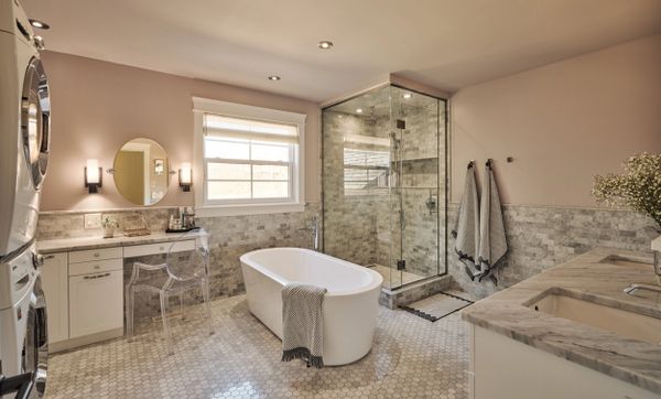 Située à l’étage, cette salle de bain combine à merveille l'élégance et la fonctionnalité. Profitez d'une spacieuse douche vitrée et d'une baignoire indépendante pour vos moments de relaxation. Un espace maquilleuse intégré et un rangement abondant rendent l'organisation simple et efficace. Avec deux lavabos sur un somptueux comptoir en marbre, et la présence d'une laveuse et d'une sécheuse, cette salle de bain est parfaitement équipée pour répondre à toutes les exigences au quotidien dans le plus grand des conforts.