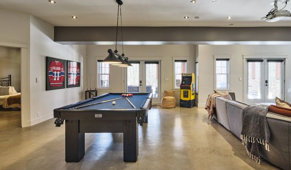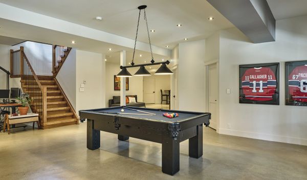Les deux portes jardins de ce sous-sol walk-out créent une transition fluide vers le patio et la cour extérieur, en plus de laisser entrer une abondance de lumière naturelle. L'ensemble est versatile et adaptable au gré des besoins de la maisonnée. On peut assez aisément y installer une cuisine, un espace bar, ou même un logement parental indépendant.