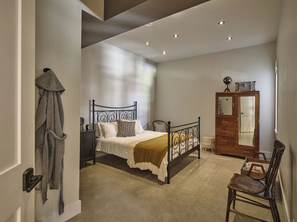 La chambre à coucher du sous-sol est un refuge tranquille, complété par une salle de bain attenante équipée d'une douche vitrée moderne, combinant fonctionnalité et design contemporain.
